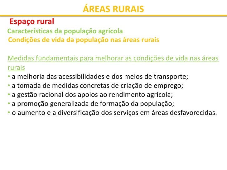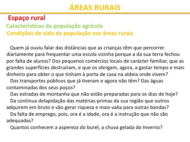 23. 23. ÁREAS RURAIS Espaço rural Características da população agrícola Condições de vida da população nas áreas rurais Quem já ouviu falar das distâncias que as crianças têm que percorrer diariamente para frequentar uma escola vizinha porque a da sua terra fechou por falta de alunos? Dos pequenos comércios locais de carácter familiar, que as grandes superfícies destruíram, e que os obrigam, agora, a gastar tempo e mais dinheiro para obter o que tinham à porta de casa na aldeia onde vivem? Dos transportes públicos que já tiveram e agora não têm? Das águas contaminadas dos seus poços? Das estradas de montanha que não estão preparadas para os dias de hoje? Da contínua delapidação das matérias-primas da sua região que outros adquirem em bruto e vão gerar riqueza e mais-valia para outras bandas? Da falta de emprego, pois, ora é a idade, ora é a instrução que não são adequadas? Quantos conhecem a aspereza do burel, a chuva gelada do Inverno?