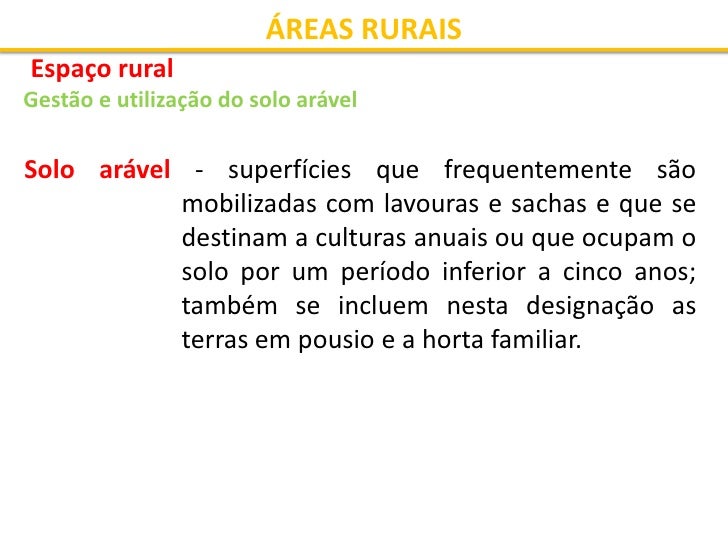 25. 25. ÁREAS RURAIS Espaço rural Gestão e utilização do solo arável Solo arável - superfícies que frequentemente são mobilizadas com lavouras e sachas e que se destinam a culturas anuais ou que ocupam o solo por um período inferior a cinco anos; também se incluem nesta designação as terras em pousio e a horta familiar.