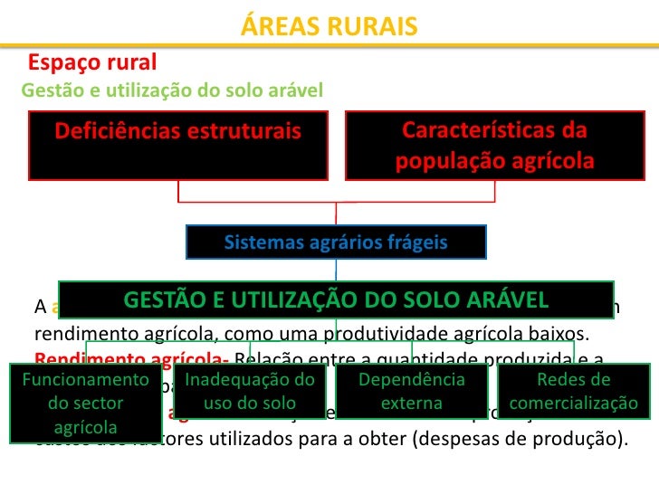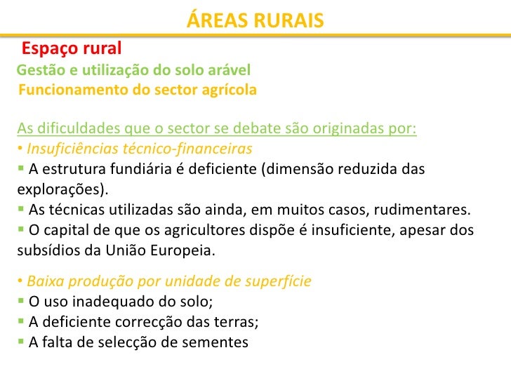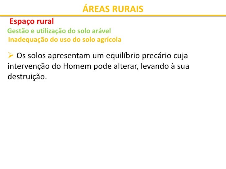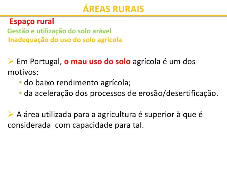 31. 31. ÁREAS RURAIS Espaço rural Gestão e utilização do solo arável Inadequação do uso do solo agrícola  Em Portugal, o mau uso do solo agrícola é um dos motivos: • do baixo rendimento agrícola; • da aceleração dos processos de erosão/desertificação.  A área utilizada para a agricultura é superior à que é considerada com capacidade para tal.