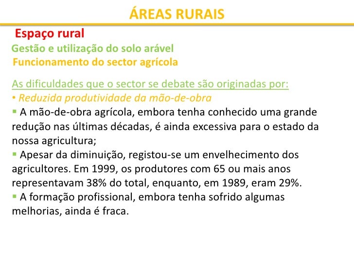 28. 28. ÁREAS RURAIS Espaço rural Gestão e utilização do solo arável Funcionamento do sector agrícola As dificuldades que o sector se debate são originadas por: • Reduzida produtividade da mão-de-obra  A mão-de-obra agrícola, embora tenha conhecido uma grande redução nas últimas décadas, é ainda excessiva para o estado da nossa agricultura;  Apesar da diminuição, registou-se um envelhecimento dos agricultores. Em 1999, os produtores com 65 ou mais anos representavam 38% do total, enquanto, em 1989, eram 29%.  A formação profissional, embora tenha sofrido algumas melhorias, ainda é fraca.
