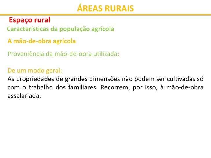 3. 3. ÁREAS RURAIS Espaço rural Características da população agrícola A mão-de-obra agrícola Proveniência da mão-de-obra utilizada: De um modo geral: As propriedades de grandes dimensões não podem ser cultivadas só com o trabalho dos familiares. Recorrem, por isso, à mão-de-obra assalariada.
