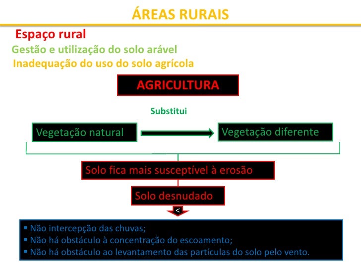 30. 30. ÁREAS RURAIS Espaço rural Gestão e utilização do solo arável Inadequação do uso do solo agrícola AGRICULTURA Substitui Vegetação natural Vegetação diferente Solo fica mais susceptível à erosão Solo desnudado <  Não intercepção das chuvas;  Não há obstáculo à concentração do escoamento;  Não há obstáculo ao levantamento das partículas do solo pelo vento.