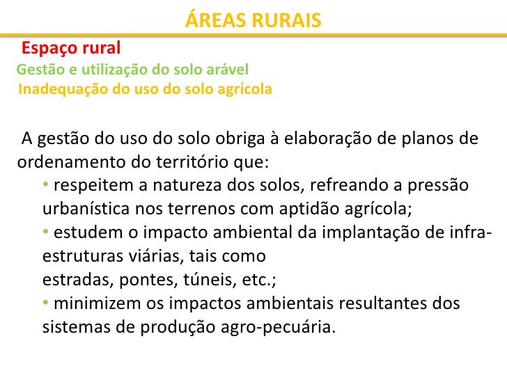 33. 33. ÁREAS RURAIS Espaço rural Gestão e utilização do solo arável Inadequação do uso do solo agrícola A gestão do uso do solo obriga à elaboração de planos de ordenamento do território que: • respeitem a natureza dos solos, refreando a pressão urbanística nos terrenos com aptidão agrícola; • estudem o impacto ambiental da implantação de infra- estruturas viárias, tais como estradas, pontes, túneis, etc.; • minimizem os impactos ambientais resultantes dos sistemas de produção agro-pecuária.