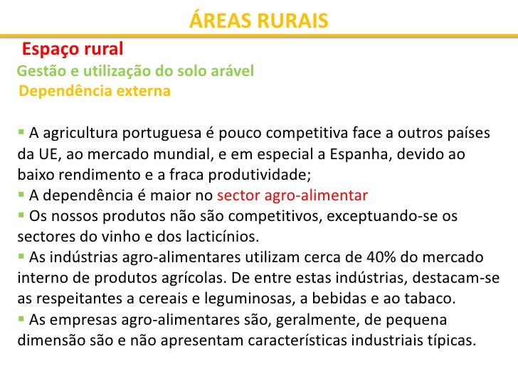 34. 34. ÁREAS RURAIS Espaço rural Gestão e utilização do solo arável Dependência externa  A agricultura portuguesa é pouco competitiva face a outros países da UE, ao mercado mundial, e em especial a Espanha, devido ao baixo rendimento e a fraca produtividade;  A dependência é maior no sector agro-alimentar  Os nossos produtos não são competitivos, exceptuando-se os sectores do vinho e dos lacticínios.  As indústrias agro-alimentares utilizam cerca de 40% do mercado interno de produtos agrícolas. De entre estas indústrias, destacam-se as respeitantes a cereais e leguminosas, a bebidas e ao tabaco.  As empresas agro-alimentares são, geralmente, de pequena dimensão são e não apresentam características industriais típicas.