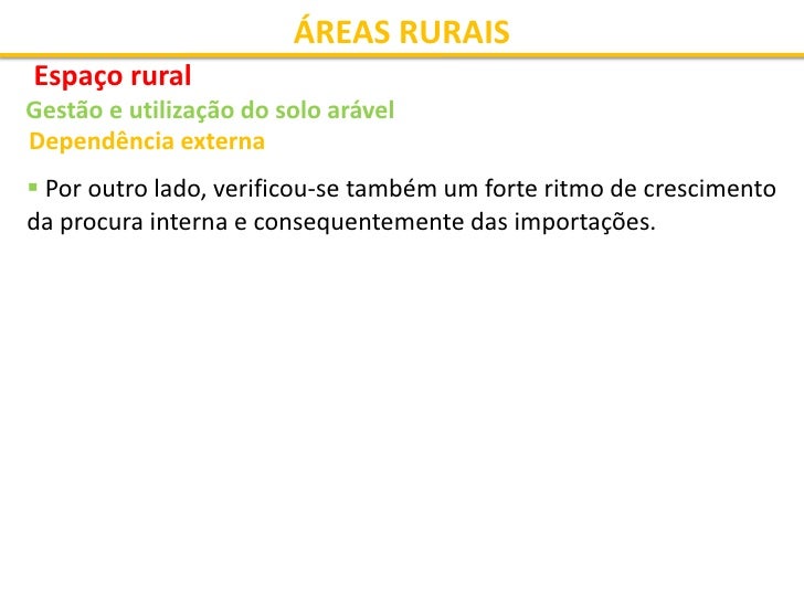 36. 36. ÁREAS RURAIS Espaço rural Gestão e utilização do solo arável Dependência externa  Por outro lado, verificou-se também um forte ritmo de crescimento da procura interna e consequentemente das importações.