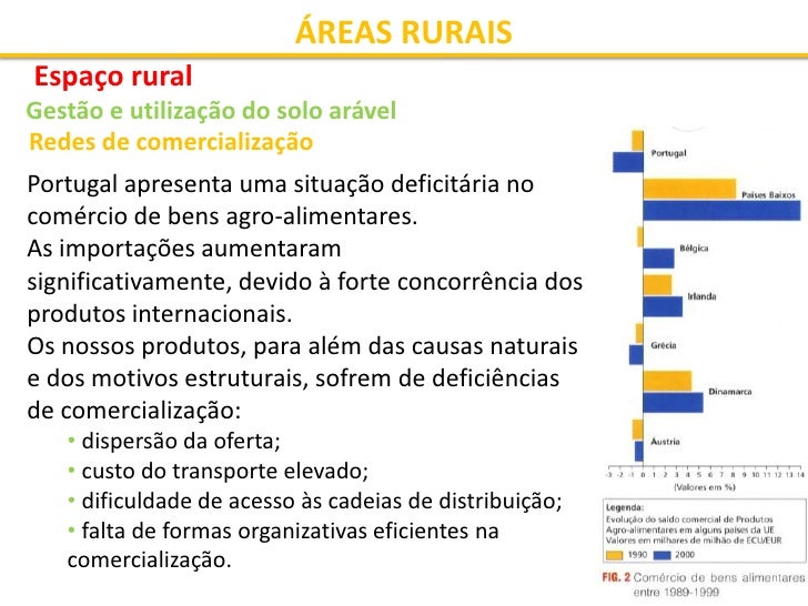 35. 35. ÁREAS RURAIS Espaço rural Gestão e utilização do solo arável Dependência externa  As empresas agro-alimentares localizam-se nas Áreas Metropolitanas de Lisboa e do Porto, devido à proximidade dos maiores mercados e pela disponibilidade de recursos humanos.  A maior integração de Portugal nos mercados internacionais fizeram aumentar significativamente as importações agro- alimentares.  Apesar de se ter registado uma tendência para a modernização das estruturas agro-industriais (modernização tecnológica, aumento da concentração da produção, incorporação de elementos relativos à imagem e marca dos produtos), há ainda dificuldades de inserção nos mercados exteriores. No entanto, o valor das exportações aumentou na última década do século XX.