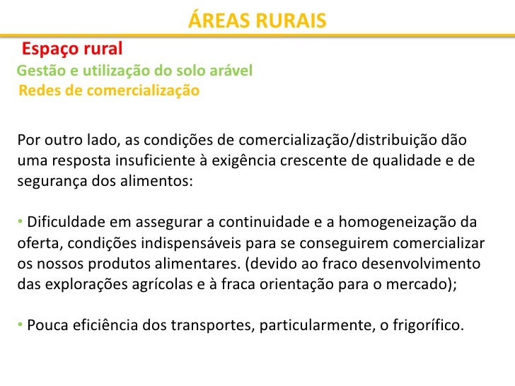 38. 38. ÁREAS RURAIS Espaço rural Gestão e utilização do solo arável Redes de comercialização Por outro lado, as condições de comercialização/distribuição dão uma resposta insuficiente à exigência crescente de qualidade e de segurança dos alimentos: • Dificuldade em assegurar a continuidade e a homogeneização da oferta, condições indispensáveis para se conseguirem comercializar os nossos produtos alimentares. (devido ao fraco desenvolvimento das explorações agrícolas e à fraca orientação para o mercado); • Pouca eficiência dos transportes, particularmente, o frigorífico.