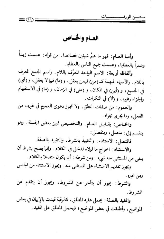 7. 7. العام والرامي وأما الضامن فهوما عأ شيئين فصاعدا لح من قولهم عممعننعخ زيدا وعمرأ بانطايا، وعمممتجميح الناس بالعطاياس ع و وألفاظه أربعة إ الاسم الواحد العزف باللام . واسم الجمع العرف باللاب٠ والأسماء المبهمةى(من) هيمن يعقل، و(ما) قيما لا يعقل، و(أي) فى الجمبع، و(أين) في المكان و(متى) في الزمان و(ما) في الاستفهام نألجزاع وغيرهم و(لا) في النكراست٠ ٠ ‎ ‏‎ والعموم إ من صفارت النطق. ولا تحوز دعوى للعموم لي غيري ، من الفعل، وما يجرىمجراه٠ ام والخامرت يقابل العام ا والئخصيصر قييزبعض الجملة. وهو ينقسمإلىبمتصل،وينفصلن هي ٠ما لالمتصلن الاستثناء. والتقيد بالشرط، والتقييد بالصفة. والاستثناء ب اخراج ما لولاه لدخل في الكلام ٠ وانها يصبح بشرط أن يبقى من المستثنى منه شيء ٠ ومن شرطه ب أن يكون متصلا بالكلام لح ويجوز تقديم الاستثناء على المستثنى منه ٠ ويجوز الاستثناء من الجنس ومن غي ا و . ٠ ع والشراب يحوز أن يتأنرعن المشروط. ويجوز أن يتقدم عن المشروط ٠ والمقيد هالصقة ب يحمل عليه المطلق ، كالرقبة قيدهث بالايمان في بعضر المواضع، وأطلق تا في يعطس المواضع،٠ فيحمل المطلق على المقيد.