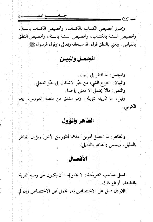 8. 8. ويجوز تخصيهر الكتاب بالكتاب، وتخصيصر الكتاب. باالسنةا،ا . . وتخه عرعهم ل السنة بالعاب ، ط وتخصيص السنة بالسنة ، وقنصيصإ النطر ٠ لالقياش ٠ ونعني بالنطق/ ول الا سبحانه وتعالى، فقول الرسول وفللأا٠ ‎ ‏‎ ن ا المجصل والمهن ا ٠ . والمهمل ن نا افتقار إل البيان لح واليان ب اخراج الشيءامن جنز الأشكال إل حنز التجلي ٠ ى ا ا والنصب مالا ينمال الا فعنى واحدا . ه . الظدهروافرس وقللت ماحويلهأ تنزيلهم فيفو مشتق مل منصترالعرويا،روعإ ارز ا الكرسى. ن ٠ ه إ ة . ا والظاهر ما ا حتي لمنير للندهمذظهرمل الآخرا ويؤورالظاها . ا ع ا بالدللراوي يسمنى(الظاهاربالدليل» ٠ ٠ ن ا ا تهأفعسال اميل صاحب اللرفضلة ن لا يخلو إلا أن ايكو. نر ومها االقربةا والطاعة ، ) أو غير ذلك ٠ ا ه ‎ ‏‎ . للنيل دليل علىا الرخمصانر نبها يجنل اعلى الالنمتصامل ايان ( اب ا ه