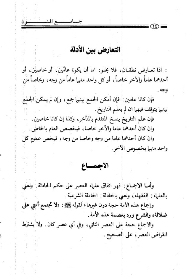 10. 10. االتعأرهر بين الأدلة ب اذا تمارضر نطقانا،٠ قللأ يخلق اما أن يكونا عانينا ٠أو خاسيان، أو أحدهما عاما والاخر خافما، أو كل واحد منهما عامأ من وئه، ولجاسأ مان وجه بينهمايتوقففيهماانلميننمالتارتر . ط ٠ ن فإن علم التاريخنيعخ المتقدم بالمتنر، وكذا إن كانا خاصين ع . لم وان كان أحدهما ماما والاخر خاصا، فيخصص العام بالخاطز ا ه هم وان كان أحدممااعامامن وجه وخاصا من وجه، قياسى عنى كل واحدمنهمابخمسسوخر٠ ط لج الاجمل وأنا الاجماع إ افهو اتفاق علماء العصر على حكم الحادثة ز ونعلي بالعلماء ز الفقهاء( ونير بالحادثة إ الحادثة الشرعية ٠ ‎ ‏‎ و ه س وإجماع هذه اليرز حجآ دول غيرها ؛ لقوله لها ب «لا نجنمعامهي على ضلالة» والشرع ورد يناصمةلىه الأمة ٠ ٠ و ٠ ‎ ‏‎ ا ٠ والاجماع حجة فلم المصر الثاني، وفي أي عصر كان . ولاايشتزط انقراضرالعصر، علىالصحيع٠ ٠ فإن كانا عامين إ ا فإن لكن الجمع بينهما مع، وإن لم يمكناالجميا . ا ز