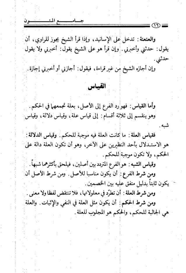 12. 12. يقةررمق ا تلا جاما المارون والهنهنة ن تدللفلاالإنانيد، وإذا قرأ الثمين هزنا للراوي افا ع . لم . . ه ا القياسى. .وأماالقيانرن قهواررالمع إلى الأصل، بعلة تجمعها في الحكم. ا ا هوهزينقسم الى ثلاثة اقام إ إلى قياس علة٠، وقياردلالةم وثياسرز شبه. ‎ ‏‎ ا ا نلب ) ٠ لقياس ا٠لعلقإ ما ناىنتة العلة قيه نوجبة للحكم ا وقياس الذلإلة زا ا هو الاستدلال بأحد النظيرين على الاخر وهوأن تكؤن للعلة بالة عللى ه الحكم،ولااتكونموجبةأللحكب ه ٠ ٠ اء ٠را هل وقياس الشبه ب هواالفرع المقيد يناصلين، فهلحق باكثرمما٠ شبها. ا ابه ومن شرط الفرع ا أن يمون مناسبلللأصل . نمن شرط الأصل أنا يعفه ط يكون ئابتأيدليل متفق عليه بين الخصمين ح و ومن٠شرطا الملة ب أن تطرب في معلولاهاا فلا تنتقضر لفظا ولا معانى { إ ز ومن شرخ ايكه ا ألم لكون مثل العلة في النفي والاليات ، إالعلقا ط في الجالبة للحكم ، والحكم هو المجلوب لل٠علهته ط يقولن حدثني بلخلنينوإن نقرأ هوعلىالشبع يقولا لغيرني ولاايقولاا ا وإن أجازة الشبع فنغيرقراءة، فيقول. . أجازني لولخرني إمثانة٠ر ا . اب