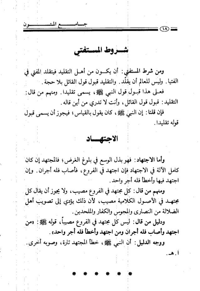 14. 14. لاثسرومد ا ٠ سمه لمستقئني م . ومن شرط المسننلي ب أفة يكون من أهل التقليد فيتقلد المفتي في ‎ ‏‎ س فعلى هذا قرلاقولالنبي لك يسمى تقليدا. وعنهم منقالن٠ ‎ ‏‎ هم . فإن قلبا. . إن النهل نقلاه كان يقولبالقياسر،. قيجوزأنيسمنىقبولإ قوليهتقليدبر ٠ ة الاجتهاد وأما الاجتهاد ب فهاهوبذل الوسم في بلوخ الغرضر،. فالمجتهديل كانو كامل الآلة في الاجتهادفان اجتهد في الفروع. قأصابفله أجران ٠ وإن( اجتهدفيهاوأخطأقلهألجرواحد٠ ج ه ن ٠ ومنعهم من قال ؛ بمال مجتند في الفروع مصيب، ولا يجوز أن يقال كلا مجتهد فيه الأصول الكلامية مصيب، لأن ذلك يؤدي إلى تصويخي أهل الضلالة من النصارى وايجوما والكفاروالملندين٠ ا ه ا ‎ ‏‎ ا ودليل من قال إ لمس كال مجتهد في الفروع مصيبأ، قوله فلا ا سنا اجتهد وأصاب قله أجر( ومن اجتهد وأخطأ قله أجر واحده . ١ ٠ ا ووجه الدليل. . ألم النلى نقلق خطأ المجتهد تارة، وصوبه أفرىا٠ آ ٠ ض ا هدا ، ٠ . . ٠
