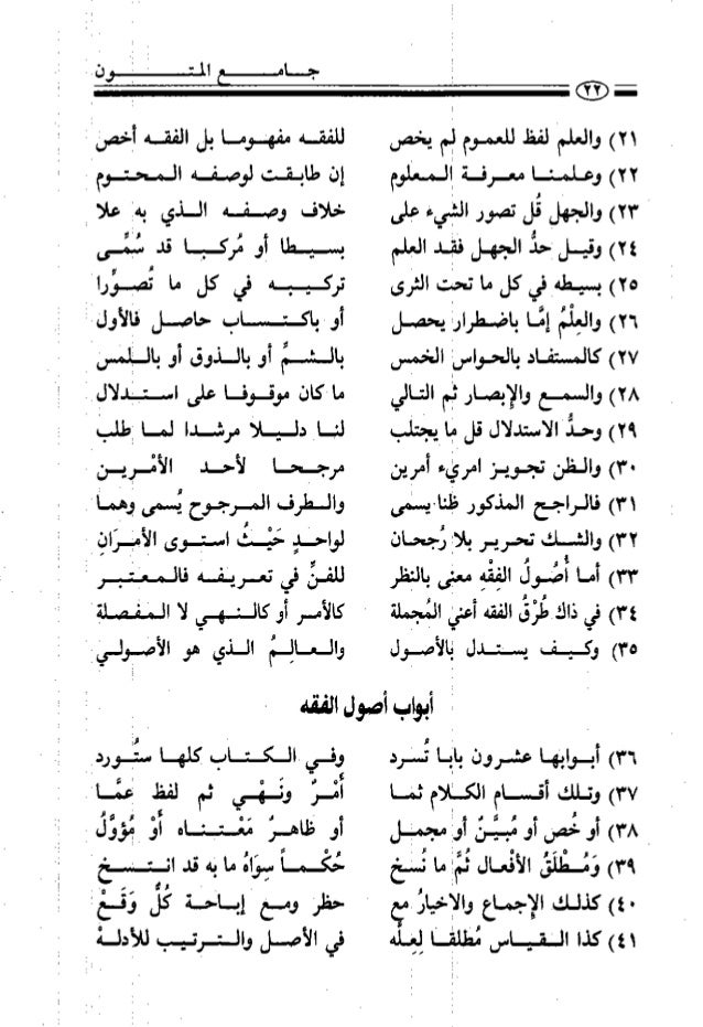 21. 21. ٧اا) وجخأيضأكون ذلك البدل ٠ ٨ ١ ا ) ثم البمتناأ بالكتاب ينسخ ٩اا) وهم يجز ان ينسخ البمتنا؛ ه٢ا) وزو تواتر بسند نسخ ا٢أ) واختار قونأ نسخ ما تواترا ضعف او اضذ هنا قد بطل كإ و إ ء ب ب ن ٠ با باب في بيان ما يقهر في اهعارقر بين الأدلة والترجيح ٢٢اا بعانطر انطقى في الأحكام » ا ) لمسا نمور أو نصومم فيهما و لإ ا ) أو ليخ كل منهما ويعتبر ه٢ا) لالجصع نمنن ما تسارضمنأ ٦اا) نننن لا إنكان لالضوتل لا٢ ا ) لان ملننا وقت بن منهما يله٢ ام وثسصوا في الثالث المعلوم اا٢ ١ ) ولى الأخير شطر كل كوني يمم على أر-ة أهمسام لوبن ننقي ليخ نهنك نننسا ئإ من الوصفين في وبع ظهط ر ا،لاولتيت واجداإ أني ما لمن يكر لابيسغ كل ننطهل لالنان ناسخ لها تقسنمسا بذيسولثعسوكم لفظ ذيالبمهم من كل شقه خضم ذاك البهي ، ما ا سلانننر ننومقإ نطق منهما بالضخ من قسميه واضرلئهما ‎ ‏‎ باب الاجماع ا٣ا) الشافي كلى أهل العصر في نلمس اللد دون بكر ٢لإأ) على اعتبار نكه أمر قد حدمح شرعا كنغنق السلام بالسدث ٣ها) اعتنج بالاجماع من دى الأمة لا غيرها إن خصصت بالسد مز بعد لي كله عصسر اقيلا