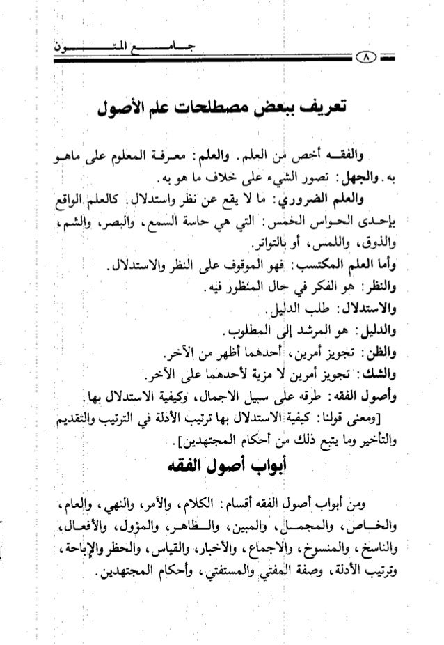 16. 16. ، وقمع أهم والعلم لفظ للسر لم يخص اهم ومدنا سراة المعلوم ٠ سا٢) والجهل نل تصور القيء على ٤ هم وقيل حث الجهل لقد العلم ٥ لإ ) بسيد في كل ما تحض الثرى اا٢) والمملة إنا باضطرار يحصل لما٢) كالمسنضاد بالعوامل الخمس اهم والسمسم والابصار ثم التالي أآ) وعذالاستدلال قل ماجتلب هس١) والظن تجويز امريء أمرين ا٣آ فالراجح المذكور ظمنا٠يسنى ا٣آ والنسك تحرير بلاا نجسان سأ٣) أسا اشوؤ القنب معنى بالا ٤سأ) في ذالونللزنإ الفقه أمني النجمة هلإ) وكيف يسددلا بالأمين ااضسامسسسب ا ٠ ا يضسااونا للفقه ٠ مفهطومابلالققخلخعزا إن طابيقد لوسي السموم . ا خلاف وصي الذي بها علا أ بسيطا أو تركيا قد نثر ب تركي- في كل ما بهمغربى أوباكصساب حامض ذلأولاا بالسشخ أو بالطوق أو باليلنسا ماكان موقوفا على اس-دلالي. لنا دلهلأ مرشدا لما يطلبا . مرجعا لأحد الأنجيل والطرف الرجوع نسمى نهاه لواحخ غنسنما استوى الأيراني ا للفن لي تعريضه لا ا لمعغ٠سر ن ٠ كالري أوكالعهي لا الننصلؤا والماني الاي هو الأضجلفا لهي اصولا الفقه اا٣) أبوابها عشرون بابا ننرد ٧سا) ولك أقسام الكلام ثضا . ع ، ء ، ٨سا) أو نعر او مبين أو مجمع ٩عأ) نن ه نلتمنللتاى الألعث ثم ما بمخ ، لما كذلك الإجماع والاخيار لإ أ ٤) كذا السصاس نللقا ليله ولس للعتاب كلها سيساورد٠ . هم نا ب . ، ام له ، . انخ و-ي لم لفظ مند ن نونة ا ، أو ظاهط ننمي ا غضة نالها( . ان . ، نتنتصغر ٠ مهم باو ءلا لع، هن حظر وضع إباحة كل وضع. في الأصل والرقيب للثنإ .