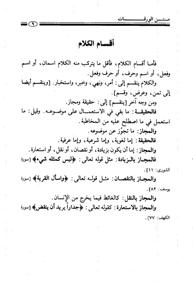 17. 17. ا (تقهع سععع و هكذا أحكام قيل تني فنتهل نهلا لإ » والعند في نننني ونستفيني ٤ » كذاك في قض وعرف وجدا . ملم ) بقسم الكلام للاعمار ٦٤) ثم الصم ثانيا قد انقسم ا ٧٤) ونالا إللى مجاز وإلس ٨٤با من ذاك في موضوعه وقيل ها ٩٤) ابسطها ثلاثة شر . وه) ة الم-انل ما به نبضوزا اهم بضقص أو زيادا أو نقل لإه) ونغ المراد في سؤال القرين ٣هأ وكازدياد الكاف في كمثله يه) رائشهاكقوله تعالى هم) نجد! استدعاء فضل واجب ٦ه) بصيغة افض قالوجوب نفقا ا لما ٥ ) لا نع مبض دكا شرعا منة ٨ه) بل مرده عن الوجوب حتما ٠ اهه) نتس نيسن ننرأ ولا تكرارا باليه أقسام اكلاهم هها٤) هدؤ ما بنه الكلام رقننوا إسمان أوإانض وهعذ كاركبخا وجاء من اسم وعرف لي الندا والأمر والدس والاسعخيار ٠إلس تسن ولاس وقسم حقيقة وعاها ها اسننبي يجري خطابة في اصطلاح لنر والدول الوضع والننئن في اللفظ عن موضوعه تجغزا أو اسضارلإ كتننإص ،انض كما أر هي الاطر دون وزيا والسضائط السثضول عن نحلم نريد ئز يضقهر يعي هالا عقولا مسن كان دون الطالب حيث الضيعة انطت وأطلقا إبان في الضعض أو ندب للا بعمله على الشراء منها ءافى لم يرد ما٠بيقدضي النضرارا