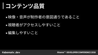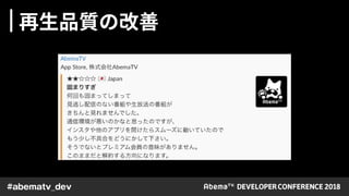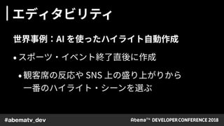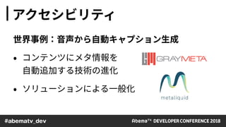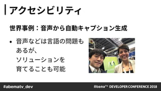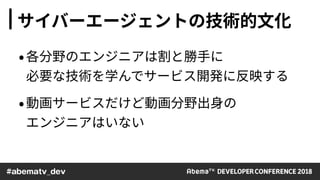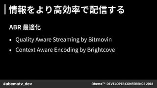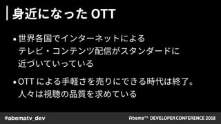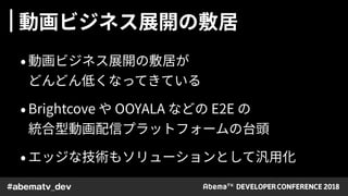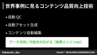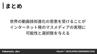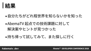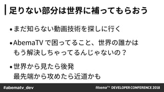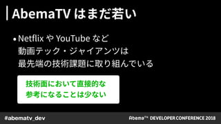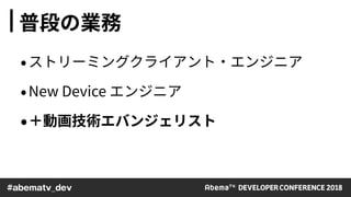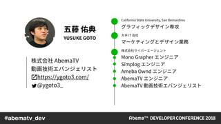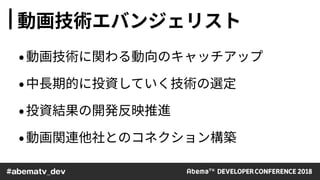 AbemaTV では、世界中で起きている動画技術の発展から得られる恩恵を最大限サービス開発に活かしていけるように『動画技術エバンジェリスト』というポジションを設置しています。国内外に直接足を運び情報をキャッチアップし、投資する技術、動向を追う技術を見極めながら開発に反映し、社内外にフィードバックしていきます。本セッションでは、激しい流れの動画技術トレンドにおいて、AbemaTV はどんな技術に注目していて、どのように投資していこうと考えているかをお話します。