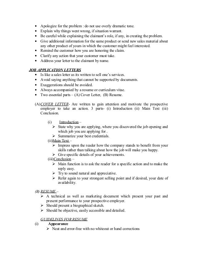 10. 10. • Apologize for the problem : do not use overly dramatic tone. • Explain why things went wrong, if situation warrant. • Be careful while explaining the claimant’s role, if any, in creating the problem. • Give additional information for the same product or send new sales material about any other product of yours in which the customer might feel interested. • Remind the customer how you are honoring the claim. • Clarify any action that your customer must take. • Address your letter to the claimant by name.JOB APPLICATION LETTERS • Is like a sales letter as its written to sell one’s services. • Avoid saying anything that cannot be supported by documents. • Exaggerations should be avoided. • Always accompanied by a resume or curriculum vitae. • Two essential parts – (A) Cover Letter, (B) Resume. (A) COVER LETTER- Are written to gain attention and motivate the prospective employer to take an action. 3 parts- (i) Introduction (ii) Main Text (iii) Conclusion. (i) Introduction –  State why you are applying, where you discovered the job opening and which job you are applying for .  Summarize your best credentials. (ii)Main Text –  Impress upon the reader how the company stands to benefit from your skills rather than talking about how the job will make you happy.  Give specific details of your achievements. (iii)Conclusion –  Main function is to ask the reader for a specific action and to make the reply easy.  Try to sound natural and appreciative.  Refer again to your strongest selling point and if desired, your date of availability. (B) RESUME –  A technical as well as marketing document which present your past and present performance to your prospective employer.  Should present a biographical sketch.  Should be objective, easily accessible and detailed. GUIDELINES FOR RESUME (i) Appearance  Neat and error-free with no whiteout or hand corrections