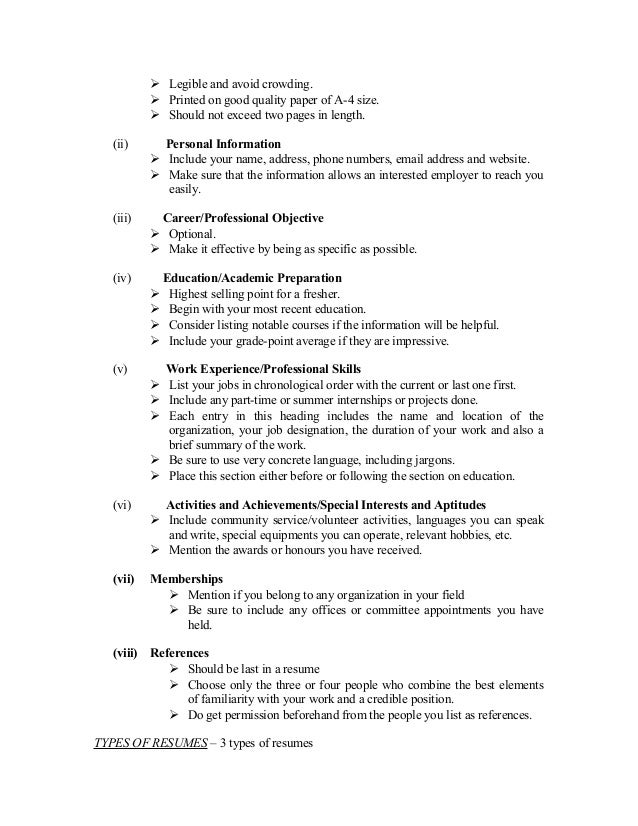 11. 11.  Legible and avoid crowding.  Printed on good quality paper of A-4 size.  Should not exceed two pages in length. (ii) Personal Information  Include your name, address, phone numbers, email address and website.  Make sure that the information allows an interested employer to reach you easily. (iii) Career/Professional Objective  Optional.  Make it effective by being as specific as possible. (iv) Education/Academic Preparation  Highest selling point for a fresher.  Begin with your most recent education.  Consider listing notable courses if the information will be helpful.  Include your grade-point average if they are impressive. (v) Work Experience/Professional Skills  List your jobs in chronological order with the current or last one first.  Include any part-time or summer internships or projects done.  Each entry in this heading includes the name and location of the organization, your job designation, the duration of your work and also a brief summary of the work.  Be sure to use very concrete language, including jargons.  Place this section either before or following the section on education. (vi) Activities and Achievements/Special Interests and Aptitudes  Include community service/volunteer activities, languages you can speak and write, special equipments you can operate, relevant hobbies, etc.  Mention the awards or honours you have received. (vii) Memberships  Mention if you belong to any organization in your field  Be sure to include any offices or committee appointments you have held. (viii) References  Should be last in a resume  Choose only the three or four people who combine the best elements of familiarity with your work and a credible position.  Do get permission beforehand from the people you list as references.TYPES OF RESUMES – 3 types of resumes