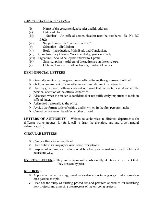 13. 13. PARTS OF AN OFFICIAL LETTER (i) Name of the correspondent/sender and his address. (ii) Date and place. (iii) Number – An official communication must be numbered. Ex- No BC 198(2) (iv) Subject line – Ex- “Premium of LIC” (v) Salutation – Sir/Madam. (vi) Body – Introduction, Main Body and Conclusion. (vii) Complimentary Close – Yours faithfully, yours sincerely. (viii) Signature – Should be legible and without prefix. (ix) Superscription – Address of the addressee on the envelope. (x) Optional Lines – List of enclosures, number of copies.DEMI-OFFICIAL LETTERS  Generally written by one government official to another government official.  Or from government officers of same rank and different departments.  Used by government officials when it is desired that the matter should receive the personal attention of the official concerned.  Also used when the matter is confidential or not sufficiently important to merit on official letter.  Addressed personally to the officer.  Avoids the format style of writing and is written in the first person singular.  Cannot be written on behalf of another official.LETTERS OF AUTHORITY – Written to authorities in different departments fordifferent works (request for fund, call to draw the attention, law and order, naturalcalamities, etc.)CIRCULAR LETTERS –  Can be official or semi-official.  Used to have an enquiry or issue some instructions.  Purpose of writing a circular should be clearly expressed in a brief, polite and courteous way.EXPRESS LETTER – They are in form and words exactly like telegrams except that they are sent by post.REPORTS –  A piece of factual writing, based on evidence, containing organized information on a particular topic.  Used for the study of existing procedures and practices as well as for launching new projects and assessing the progress of the on-going projects.