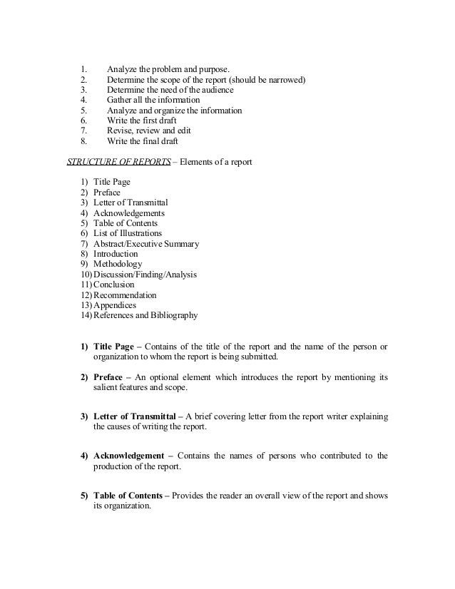 16. 16. 1. Analyze the problem and purpose. 2. Determine the scope of the report (should be narrowed) 3. Determine the need of the audience 4. Gather all the information 5. Analyze and organize the information 6. Write the first draft 7. Revise, review and edit 8. Write the final draftSTRUCTURE OF REPORTS – Elements of a report 1) Title Page 2) Preface 3) Letter of Transmittal 4) Acknowledgements 5) Table of Contents 6) List of Illustrations 7) Abstract/Executive Summary 8) Introduction 9) Methodology 10) Discussion/Finding/Analysis 11) Conclusion 12) Recommendation 13) Appendices 14) References and Bibliography 1) Title Page – Contains of the title of the report and the name of the person or organization to whom the report is being submitted. 2) Preface – An optional element which introduces the report by mentioning its salient features and scope. 3) Letter of Transmittal – A brief covering letter from the report writer explaining the causes of writing the report. 4) Acknowledgement – Contains the names of persons who contributed to the production of the report. 5) Table of Contents – Provides the reader an overall view of the report and shows its organization.