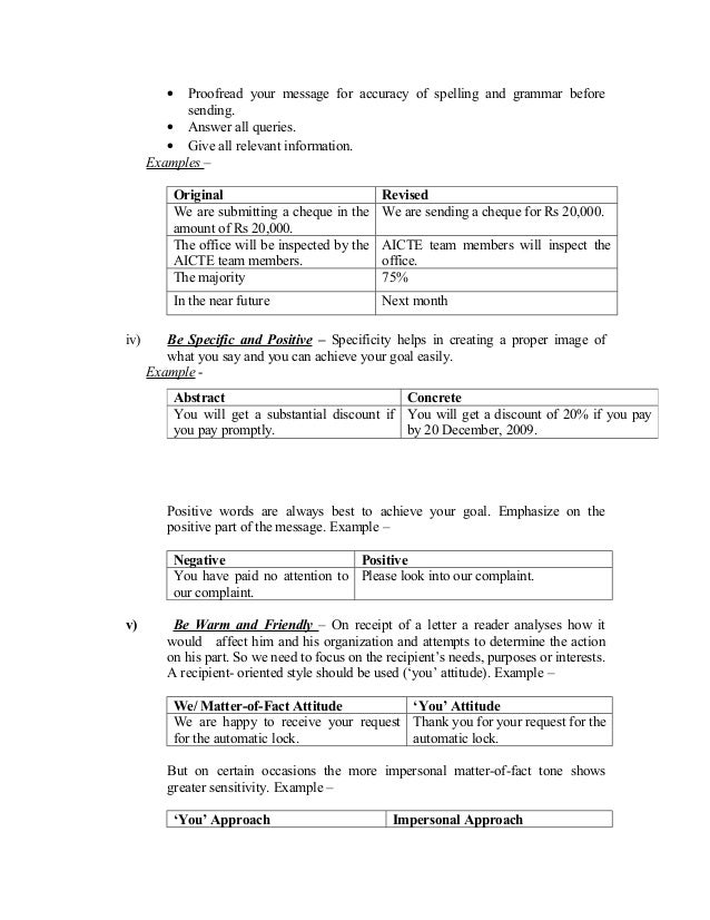 3. 3. • Proofread your message for accuracy of spelling and grammar before sending. • Answer all queries. • Give all relevant information. Examples – Original Revised We are submitting a cheque in the We are sending a cheque for Rs 20,000. amount of Rs 20,000. The office will be inspected by the AICTE team members will inspect the AICTE team members. office. The majority 75% In the near future Next monthiv) Be Specific and Positive – Specificity helps in creating a proper image of what you say and you can achieve your goal easily. Example - Abstract Concrete You will get a substantial discount if You will get a discount of 20% if you pay you pay promptly. by 20 December, 2009. Positive words are always best to achieve your goal. Emphasize on the positive part of the message. Example – Negative Positive You have paid no attention to Please look into our complaint. our complaint.v) Be Warm and Friendly – On receipt of a letter a reader analyses how it would affect him and his organization and attempts to determine the action on his part. So we need to focus on the recipient’s needs, purposes or interests. A recipient- oriented style should be used (‘you’ attitude). Example – We/ Matter-of-Fact Attitude ‘You’ Attitude We are happy to receive your request Thank you for your request for the for the automatic lock. automatic lock. But on certain occasions the more impersonal matter-of-fact tone shows greater sensitivity. Example – ‘You’ Approach Impersonal Approach