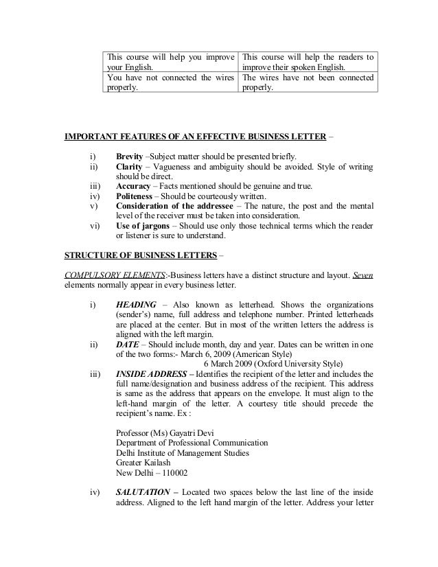 4. 4. This course will help you improve This course will help the readers to your English. improve their spoken English. You have not connected the wires The wires have not been connected properly. properly.IMPORTANT FEATURES OF AN EFFECTIVE BUSINESS LETTER – i) Brevity –Subject matter should be presented briefly. ii) Clarity – Vagueness and ambiguity should be avoided. Style of writing should be direct. iii) Accuracy – Facts mentioned should be genuine and true. iv) Politeness – Should be courteously written. v) Consideration of the addressee – The nature, the post and the mental level of the receiver must be taken into consideration. vi) Use of jargons – Should use only those technical terms which the reader or listener is sure to understand.STRUCTURE OF BUSINESS LETTERS –COMPULSORY ELEMENTS:-Business letters have a distinct structure and layout. Sevenelements normally appear in every business letter. i) HEADING – Also known as letterhead. Shows the organizations (sender’s) name, full address and telephone number. Printed letterheads are placed at the center. But in most of the written letters the address is aligned with the left margin. ii) DATE – Should include month, day and year. Dates can be written in one of the two forms:- March 6, 2009 (American Style) 6 March 2009 (Oxford University Style) iii) INSIDE ADDRESS – Identifies the recipient of the letter and includes the full name/designation and business address of the recipient. This address is same as the address that appears on the envelope. It must align to the left-hand margin of the letter. A courtesy title should precede the recipient’s name. Ex : Professor (Ms) Gayatri Devi Department of Professional Communication Delhi Institute of Management Studies Greater Kailash New Delhi – 110002 iv) SALUTATION – Located two spaces below the last line of the inside address. Aligned to the left hand margin of the letter. Address your letter