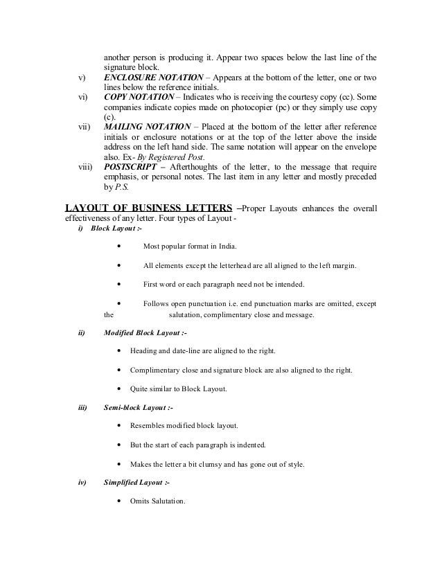 6. 6. another person is producing it. Appear two spaces below the last line of the signature block. v) ENCLOSURE NOTATION – Appears at the bottom of the letter, one or two lines below the reference initials. vi) COPY NOTATION – Indicates who is receiving the courtesy copy (cc). Some companies indicate copies made on photocopier (pc) or they simply use copy (c). vii) MAILING NOTATION – Placed at the bottom of the letter after reference initials or enclosure notations or at the top of the letter above the inside address on the left hand side. The same notation will appear on the envelope also. Ex- By Registered Post. viii) POSTSCRIPT – Afterthoughts of the letter, to the message that require emphasis, or personal notes. The last item in any letter and mostly preceded by P.S.LAYOUT OF BUSINESS LETTERS –Proper Layouts enhances the overalleffectiveness of any letter. Four types of Layout - i) Block Layout :- • Most popular format in India. • All elements except the letterhead are all aligned to the left margin. • First word or each paragraph need not be intended. • Follows open punctuation i.e. end punctuation marks are omitted, except the salutation, complimentary close and message. ii) Modified Block Layout :- • Heading and date-line are aligned to the right. • Complimentary close and signature block are also aligned to the right. • Quite similar to Block Layout. iii) Semi-block Layout :- • Resembles modified block layout. • But the start of each paragraph is indented. • Makes the letter a bit clumsy and has gone out of style. iv) Simplified Layout :- • Omits Salutation.