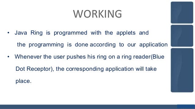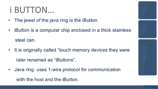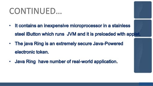 Java ring is a finger ring that contains a small microprocessor with built in capabilities for the user.Java ring is a sort of a smartcard that is wearable on a finger,a stainless-steel ring,16-millimeters (0.6 inches) in diameter.