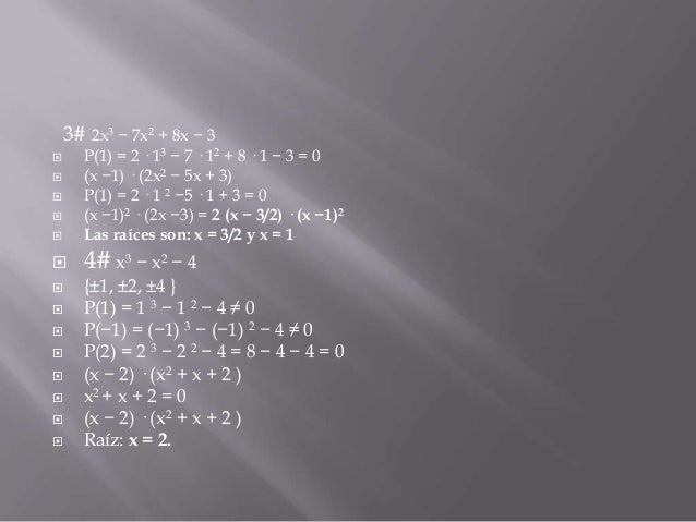 2. 2. 3# 2x3 − 7x2 + 8x − 3  P(1) = 2 · 13 − 7 · 12 + 8 · 1 − 3 = 0 (x −1) · (2x2 − 5x + 3) P(1) = 2 · 1 2 −5 · 1 + 3 = 0 (x −1)2 · (2x −3) = 2 (x − 3/2) · (x −1)2 Las raíces son: x = 3/2 y x = 1  4# x3 − x2 − 4             {±1, ±2, ±4 } P(1) = 1 3 − 1 2 − 4 ≠ 0 P(−1) = (−1) 3 − (−1) 2 − 4 ≠ 0 P(2) = 2 3 − 2 2 − 4 = 8 − 4 − 4 = 0 (x − 2) · (x2 + x + 2 ) x2 + x + 2 = 0 (x − 2) · (x2 + x + 2 ) Raíz: x = 2.