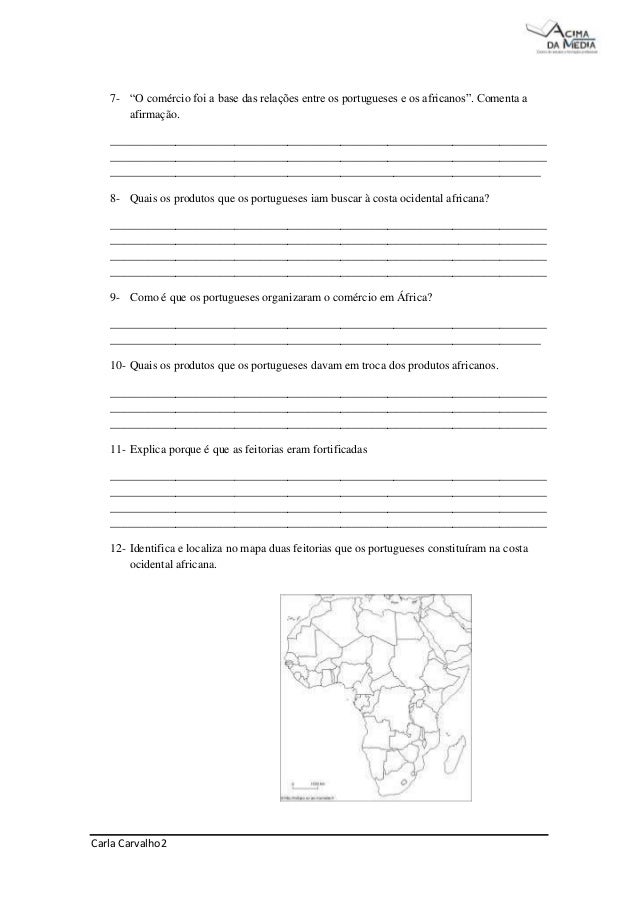 2. 2. 7- “O comércio foi a base das relações entre os portugueses e os africanos”. Comenta a afirmação. __________________________________________________________________________ __________________________________________________________________________ _________________________________________________________________________ 8- Quais os produtos que os portugueses iam buscar à costa ocidental africana? __________________________________________________________________________ __________________________________________________________________________ __________________________________________________________________________ __________________________________________________________________________ 9- Como é que os portugueses organizaram o comércio em África? __________________________________________________________________________ _________________________________________________________________________ 10- Quais os produtos que os portugueses davam em troca dos produtos africanos. __________________________________________________________________________ __________________________________________________________________________ __________________________________________________________________________ 11- Explica porque é que as feitorias eram fortificadas __________________________________________________________________________ __________________________________________________________________________ __________________________________________________________________________ __________________________________________________________________________ 12- Identifica e localiza no mapa duas feitorias que os portugueses constituíram na costa ocidental africana. Carla Carvalho2