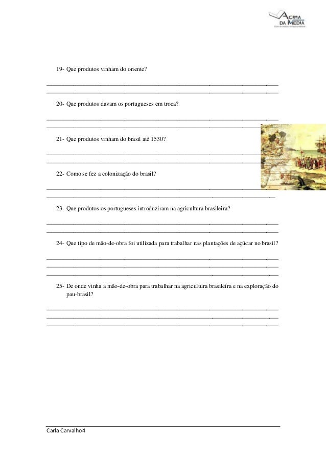 4. 4. 19- Que produtos vinham do oriente? _____________________________________________________________________________ _____________________________________________________________________________ 20- Que produtos davam os portugueses em troca? _____________________________________________________________________________ _____________________________________________________________________________ 21- Que produtos vinham do brasil até 1530? _____________________________________________________________________________ _____________________________________________________________________________ 22- Como se fez a colonização do brasil? _____________________________________________________________________________ ____________________________________________________________________________ 23- Que produtos os portugueses introduziram na agricultura brasileira? _____________________________________________________________________________ _____________________________________________________________________________ 24- Que tipo de mão-de-obra foi utilizada para trabalhar nas plantações de açúcar no brasil? _____________________________________________________________________________ _____________________________________________________________________________ _____________________________________________________________________________ 25- De onde vinha a mão-de-obra para trabalhar na agricultura brasileira e na exploração do pau-brasil? _____________________________________________________________________________ _____________________________________________________________________________ _____________________________________________________________________________ Carla Carvalho4