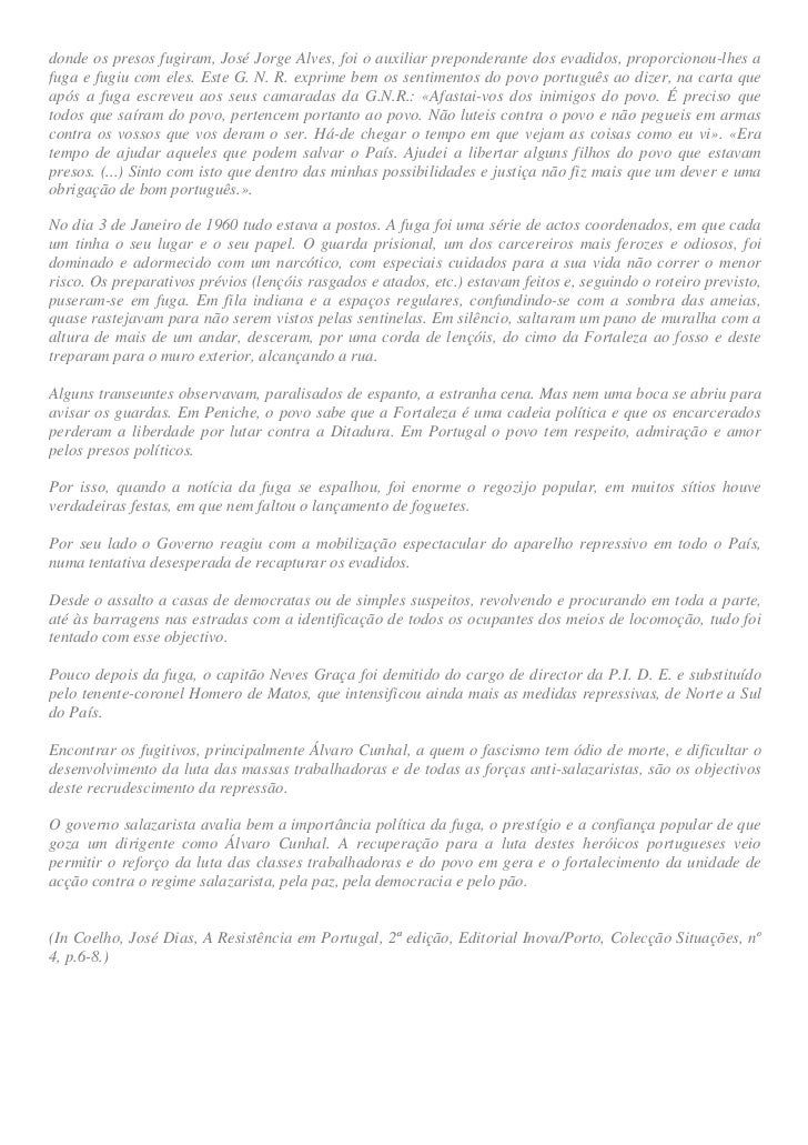 2. 2. donde os presos fugiram, José Jorge Alves, foi o auxiliar preponderante dos evadidos, proporcionou-lhes afuga e fugiu com eles. Este G. N. R. exprime bem os sentimentos do povo português ao dizer, na carta queapós a fuga escreveu aos seus camaradas da G.N.R.: «Afastai-vos dos inimigos do povo. É preciso quetodos que saíram do povo, pertencem portanto ao povo. Não luteis contra o povo e não pegueis em armascontra os vossos que vos deram o ser. Há-de chegar o tempo em que vejam as coisas como eu vi». «Eratempo de ajudar aqueles que podem salvar o País. Ajudei a libertar alguns filhos do povo que estavampresos. (...) Sinto com isto que dentro das minhas possibilidades e justiça não fiz mais que um dever e umaobrigação de bom português.».No dia 3 de Janeiro de 1960 tudo estava a postos. A fuga foi uma série de actos coordenados, em que cadaum tinha o seu lugar e o seu papel. O guarda prisional, um dos carcereiros mais ferozes e odiosos, foidominado e adormecido com um narcótico, com especiais cuidados para a sua vida não correr o menorrisco. Os preparativos prévios (lençóis rasgados e atados, etc.) estavam feitos e, seguindo o roteiro previsto,puseram-se em fuga. Em fila indiana e a espaços regulares, confundindo-se com a sombra das ameias,quase rastejavam para não serem vistos pelas sentinelas. Em silêncio, saltaram um pano de muralha com aaltura de mais de um andar, desceram, por uma corda de lençóis, do cimo da Fortaleza ao fosso e destetreparam para o muro exterior, alcançando a rua.Alguns transeuntes observavam, paralisados de espanto, a estranha cena. Mas nem uma boca se abriu paraavisar os guardas. Em Peniche, o povo sabe que a Fortaleza é uma cadeia política e que os encarceradosperderam a liberdade por lutar contra a Ditadura. Em Portugal o povo tem respeito, admiração e amorpelos presos políticos.Por isso, quando a notícia da fuga se espalhou, foi enorme o regozijo popular, em muitos sítios houveverdadeiras festas, em que nem faltou o lançamento de foguetes.Por seu lado o Governo reagiu com a mobilização espectacular do aparelho repressivo em todo o País,numa tentativa desesperada de recapturar os evadidos.Desde o assalto a casas de democratas ou de simples suspeitos, revolvendo e procurando em toda a parte,até às barragens nas estradas com a identificação de todos os ocupantes dos meios de locomoção, tudo foitentado com esse objectivo.Pouco depois da fuga, o capitão Neves Graça foi demitido do cargo de director da P.I. D. E. e substituídopelo tenente-coronel Homero de Matos, que intensificou ainda mais as medidas repressivas, de Norte a Suldo País.Encontrar os fugitivos, principalmente Álvaro Cunhal, a quem o fascismo tem ódio de morte, e dificultar odesenvolvimento da luta das massas trabalhadoras e de todas as forças anti-salazaristas, são os objectivosdeste recrudescimento da repressão.O governo salazarista avalia bem a importância política da fuga, o prestígio e a confiança popular de quegoza um dirigente como Álvaro Cunhal. A recuperação para a luta destes heróicos portugueses veiopermitir o reforço da luta das classes trabalhadoras e do povo em gera e o fortalecimento da unidade deacção contra o regime salazarista, pela paz, pela democracia e pelo pão.(In Coelho, José Dias, A Resistência em Portugal, 2ª edição, Editorial Inova/Porto, Colecção Situações, nº4, p.6-8.)