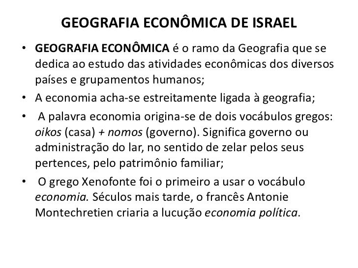 97. 97. GEOGRAFIA ECONÔMICA DE ISRAEL• GEOGRAFIA ECONÔMICA é o ramo da Geografia que se dedica ao estudo das atividades econômicas dos diversos países e grupamentos humanos;• A economia acha-se estreitamente ligada à geografia;• A palavra economia origina-se de dois vocábulos gregos: oikos (casa) + nomos (governo). Significa governo ou administração do lar, no sentido de zelar pelos seus pertences, pelo patrimônio familiar;• O grego Xenofonte foi o primeiro a usar o vocábulo economia. Séculos mais tarde, o francês Antonie Montechretien criaria a lucução economia política.