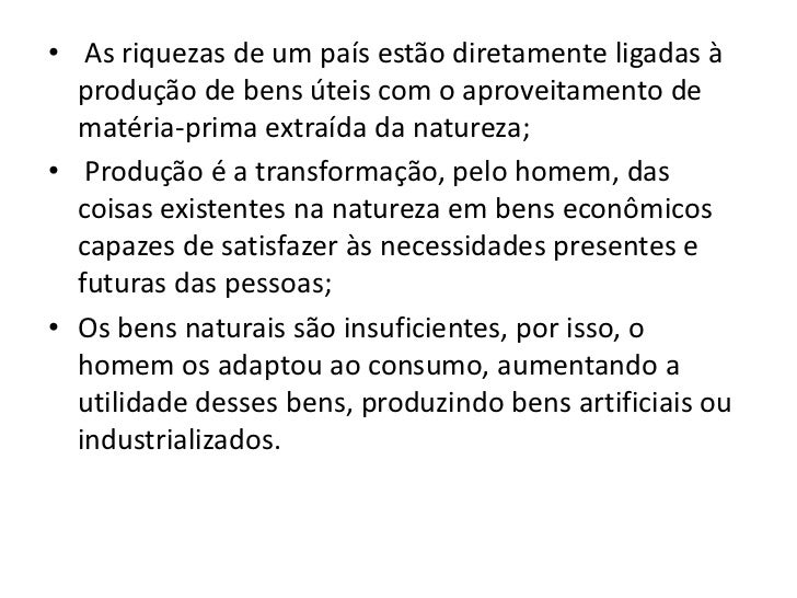98. 98. • As riquezas de um país estão diretamente ligadas à produção de bens úteis com o aproveitamento de matéria-prima extraída da natureza;• Produção é a transformação, pelo homem, das coisas existentes na natureza em bens econômicos capazes de satisfazer às necessidades presentes e futuras das pessoas;• Os bens naturais são insuficientes, por isso, o homem os adaptou ao consumo, aumentando a utilidade desses bens, produzindo bens artificiais ou industrializados.