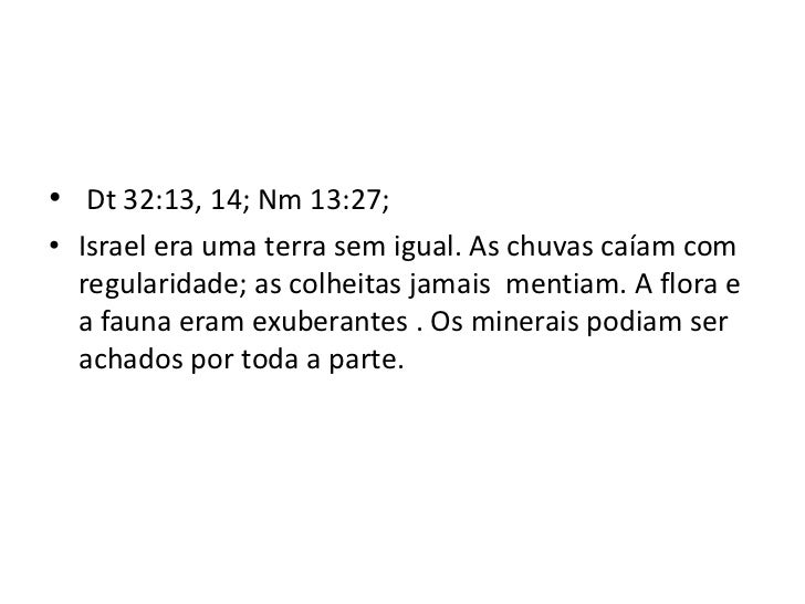 100. 100. • Dt 32:13, 14; Nm 13:27;• Israel era uma terra sem igual. As chuvas caíam com regularidade; as colheitas jamais mentiam. A flora e a fauna eram exuberantes . Os minerais podiam ser achados por toda a parte.