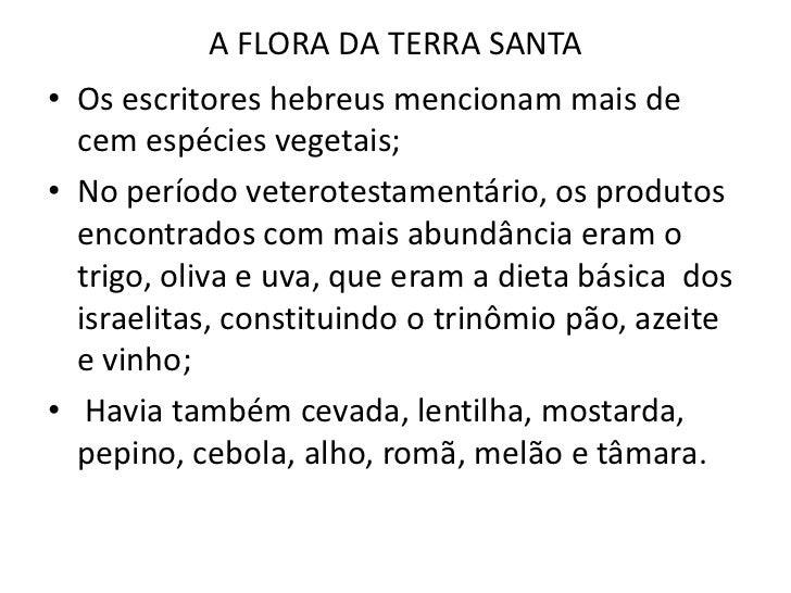 101. 101. A FLORA DA TERRA SANTA• Os escritores hebreus mencionam mais de cem espécies vegetais;• No período veterotestamentário, os produtos encontrados com mais abundância eram o trigo, oliva e uva, que eram a dieta básica dos israelitas, constituindo o trinômio pão, azeite e vinho;• Havia também cevada, lentilha, mostarda, pepino, cebola, alho, romã, melão e tâmara.