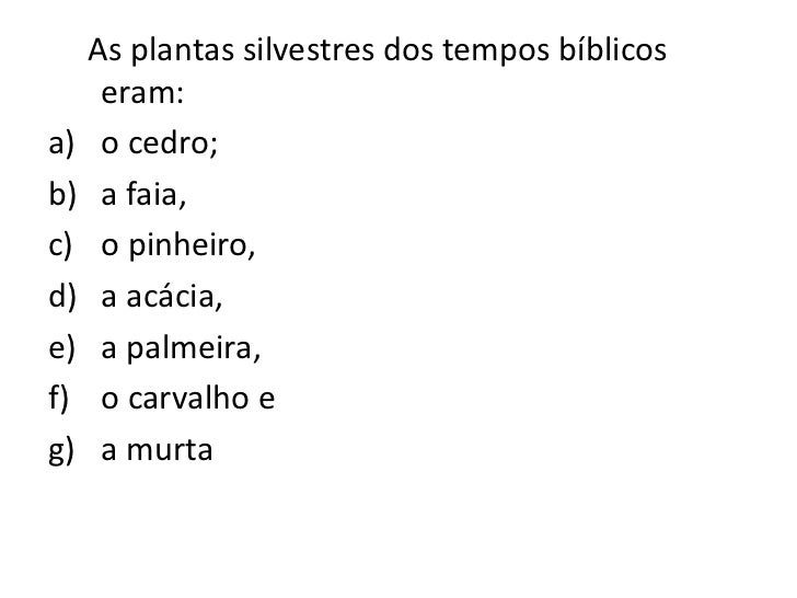 As plantas silvestres dos tempos bíblicos    eram:a) o cedro;b) a faia,c) o pinheiro,d) a acácia,e) a palmeira,f) o carval...