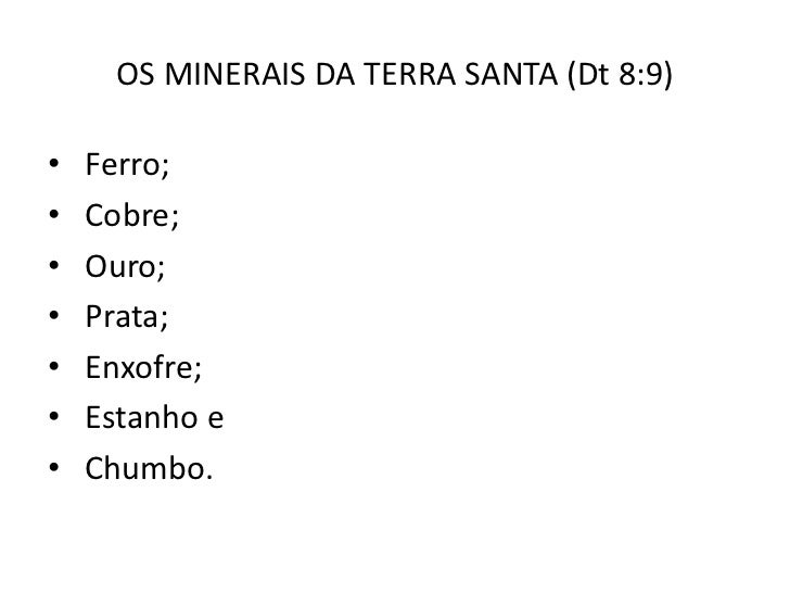 112. 112. OS MINERAIS DA TERRA SANTA (Dt 8:9)• Ferro;• Cobre;• Ouro;• Prata;• Enxofre;• Estanho e• Chumbo.