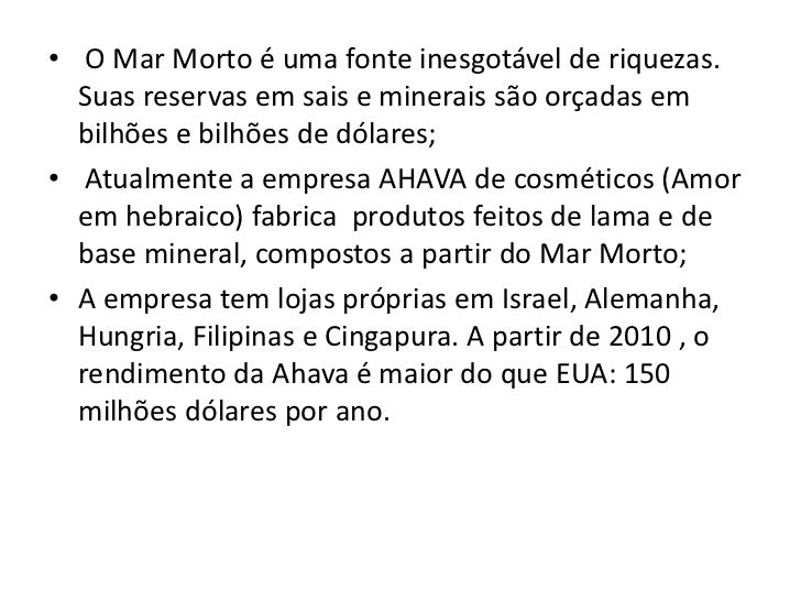 113. 113. • O Mar Morto é uma fonte inesgotável de riquezas. Suas reservas em sais e minerais são orçadas em bilhões e bilhões de dólares;• Atualmente a empresa AHAVA de cosméticos (Amor em hebraico) fabrica produtos feitos de lama e de base mineral, compostos a partir do Mar Morto;• A empresa tem lojas próprias em Israel, Alemanha, Hungria, Filipinas e Cingapura. A partir de 2010 , o rendimento da Ahava é maior do que EUA: 150 milhões dólares por ano.