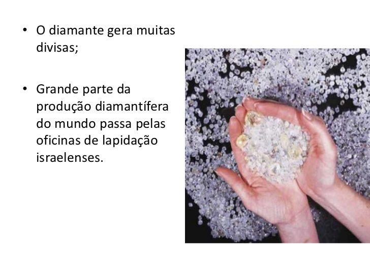 114. 114. • O diamante gera muitas divisas;• Grande parte da produção diamantífera do mundo passa pelas oficinas de lapidação israelenses.