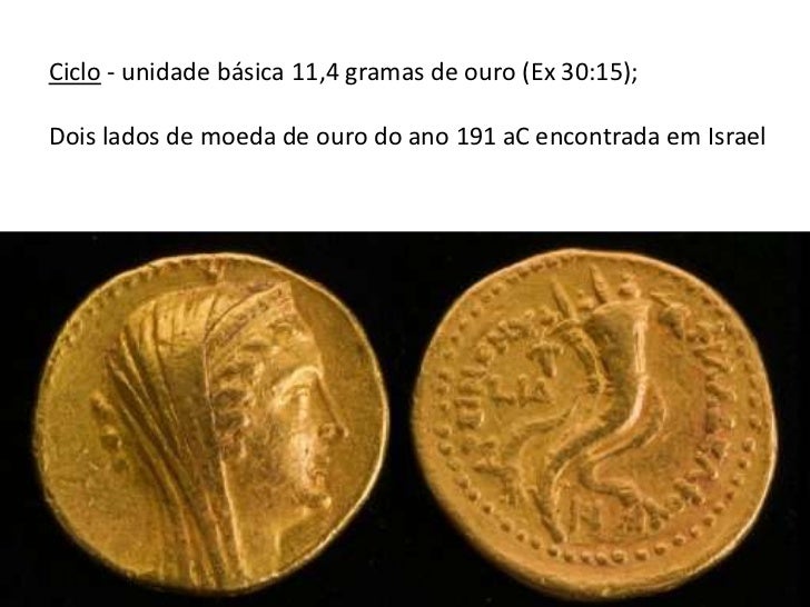 117. 117. Ciclo - unidade básica 11,4 gramas de ouro (Ex 30:15);Dois lados de moeda de ouro do ano 191 aC encontrada em Israel