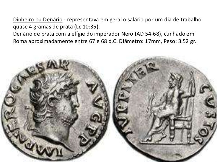 119. 119. Dinheiro ou Denário - representava em geral o salário por um dia de trabalhoquase 4 gramas de prata (Lc 10:35).Denário de prata com a efígie do imperador Nero (AD 54-68), cunhado emRoma aproximadamente entre 67 e 68 d.C. Diâmetro: 17mm, Peso: 3.52 gr.