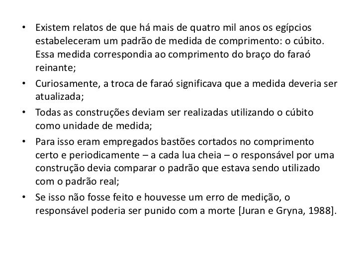 121. 121. • Existem relatos de que há mais de quatro mil anos os egípcios estabeleceram um padrão de medida de comprimento: o cúbito. Essa medida correspondia ao comprimento do braço do faraó reinante;• Curiosamente, a troca de faraó significava que a medida deveria ser atualizada;• Todas as construções deviam ser realizadas utilizando o cúbito como unidade de medida;• Para isso eram empregados bastões cortados no comprimento certo e periodicamente – a cada lua cheia – o responsável por uma construção devia comparar o padrão que estava sendo utilizado com o padrão real;• Se isso não fosse feito e houvesse um erro de medição, o responsável poderia ser punido com a morte [Juran e Gryna, 1988].