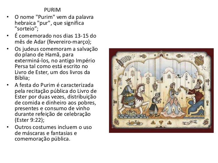 125. 125. PURIM• O nome "Purim" vem da palavra hebraica "pur", que significa "sorteio”;• É comemorado nos dias 13-15 do mês de Adar (fevereiro-março);• Os judeus comemoram a salvação do plano de Hamã, para exterminá-los, no antigo Império Persa tal como está escrito no Livro de Ester, um dos livros da Bíblia;• A festa do Purim é caracterizada pela recitação pública do Livro de Ester por duas vezes, distribuição de comida e dinheiro aos pobres, presentes e consumo de vinho durante refeição de celebração (Ester 9:22);• Outros costumes incluem o uso de máscaras e fantasias e comemoração pública.