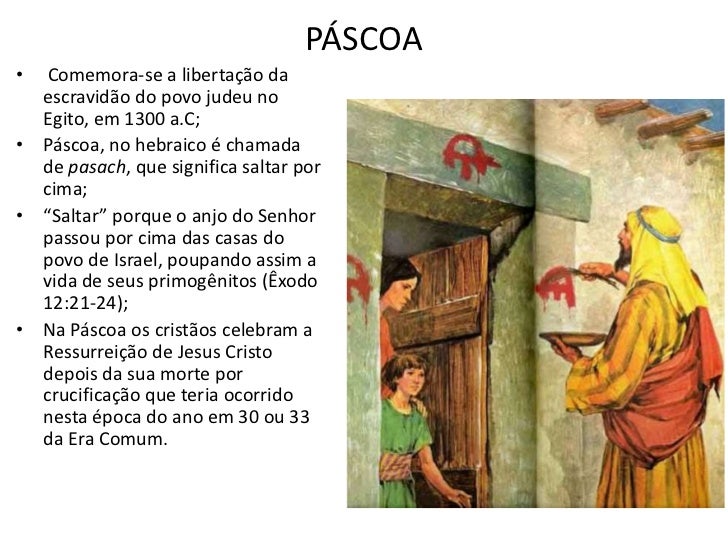 126. 126. PÁSCOA• Comemora-se a libertação da escravidão do povo judeu no Egito, em 1300 a.C;• Páscoa, no hebraico é chamada de pasach, que significa saltar por cima;• “Saltar” porque o anjo do Senhor passou por cima das casas do povo de Israel, poupando assim a vida de seus primogênitos (Êxodo 12:21-24);• Na Páscoa os cristãos celebram a Ressurreição de Jesus Cristo depois da sua morte por crucificação que teria ocorrido nesta época do ano em 30 ou 33 da Era Comum.