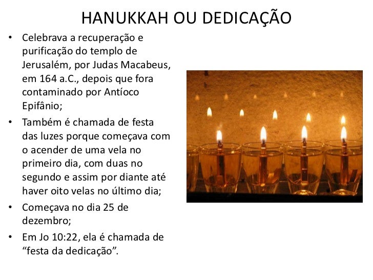 127. 127. HANUKKAH OU DEDICAÇÃO• Celebrava a recuperação e purificação do templo de Jerusalém, por Judas Macabeus, em 164 a.C., depois que fora contaminado por Antíoco Epifânio;• Também é chamada de festa das luzes porque começava com o acender de uma vela no primeiro dia, com duas no segundo e assim por diante até haver oito velas no último dia;• Começava no dia 25 de dezembro;• Em Jo 10:22, ela é chamada de “festa da dedicação”.