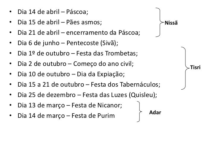 128. 128. • Dia 14 de abril – Páscoa;• Dia 15 de abril – Pães asmos; Nissã• Dia 21 de abril – encerramento da Páscoa;• Dia 6 de junho – Pentecoste (Sivã);• Dia 1º de outubro – Festa das Trombetas;• Dia 2 de outubro – Começo do ano civil; Tisri• Dia 10 de outubro – Dia da Expiação;• Dia 15 a 21 de outubro – Festa dos Tabernáculos;• Dia 25 de dezembro – Festa das Luzes (Quisleu);• Dia 13 de março – Festa de Nicanor; Adar• Dia 14 de março – Festa de Purim