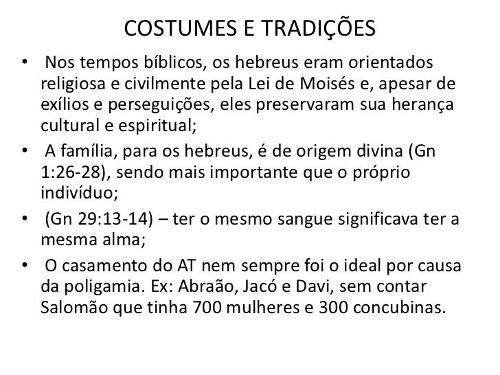 129. 129. COSTUMES E TRADIÇÕES• Nos tempos bíblicos, os hebreus eram orientados religiosa e civilmente pela Lei de Moisés e, apesar de exílios e perseguições, eles preservaram sua herança cultural e espiritual;• A família, para os hebreus, é de origem divina (Gn 1:26-28), sendo mais importante que o próprio indivíduo;• (Gn 29:13-14) – ter o mesmo sangue significava ter a mesma alma;• O casamento do AT nem sempre foi o ideal por causa da poligamia. Ex: Abraão, Jacó e Davi, sem contar Salomão que tinha 700 mulheres e 300 concubinas.