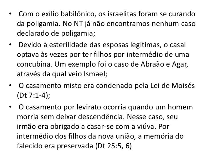 130. 130. • Com o exílio babilônico, os israelitas foram se curando da poligamia. No NT já não encontramos nenhum caso declarado de poligamia;• Devido à esterilidade das esposas legítimas, o casal optava às vezes por ter filhos por intermédio de uma concubina. Um exemplo foi o caso de Abraão e Agar, através da qual veio Ismael;• O casamento misto era condenado pela Lei de Moisés (Dt 7:1-4);• O casamento por levirato ocorria quando um homem morria sem deixar descendência. Nesse caso, seu irmão era obrigado a casar-se com a viúva. Por intermédio dos filhos da nova união, a memória do falecido era preservada (Dt 25:5, 6)