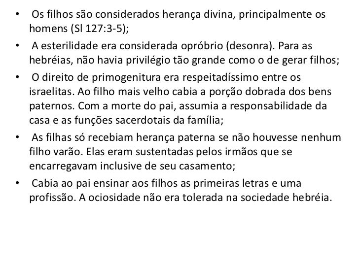 131. 131. • Os filhos são considerados herança divina, principalmente os homens (Sl 127:3-5);• A esterilidade era considerada opróbrio (desonra). Para as hebréias, não havia privilégio tão grande como o de gerar filhos;• O direito de primogenitura era respeitadíssimo entre os israelitas. Ao filho mais velho cabia a porção dobrada dos bens paternos. Com a morte do pai, assumia a responsabilidade da casa e as funções sacerdotais da família;• As filhas só recebiam herança paterna se não houvesse nenhum filho varão. Elas eram sustentadas pelos irmãos que se encarregavam inclusive de seu casamento;• Cabia ao pai ensinar aos filhos as primeiras letras e uma profissão. A ociosidade não era tolerada na sociedade hebréia.